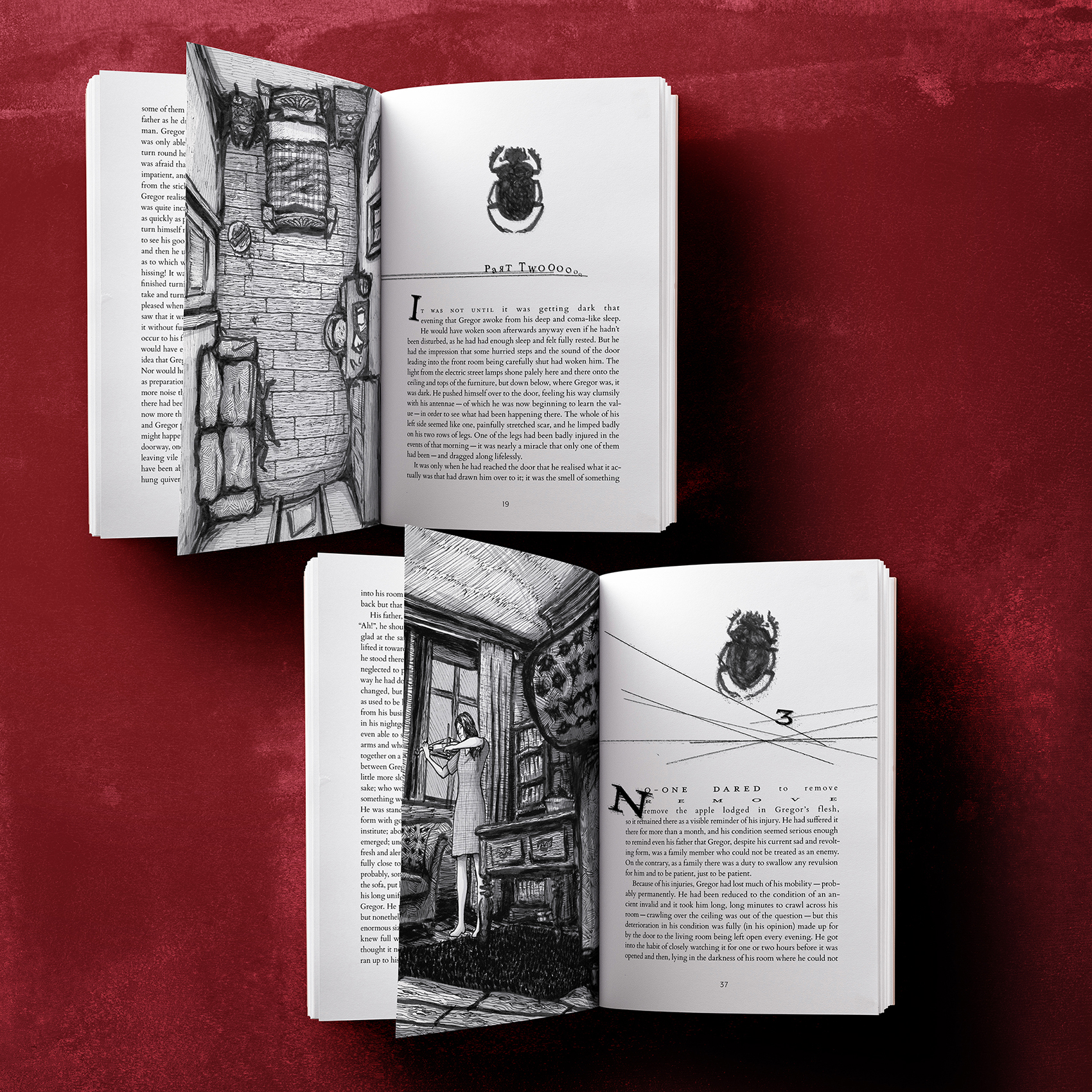This project was a full layout design and illustrations for Franz Kafka’s short story The Metamorphosis. The illustrations and chapter titles within the book get gradually more corrupted, reflecting the main character's mental state as the story progresses.