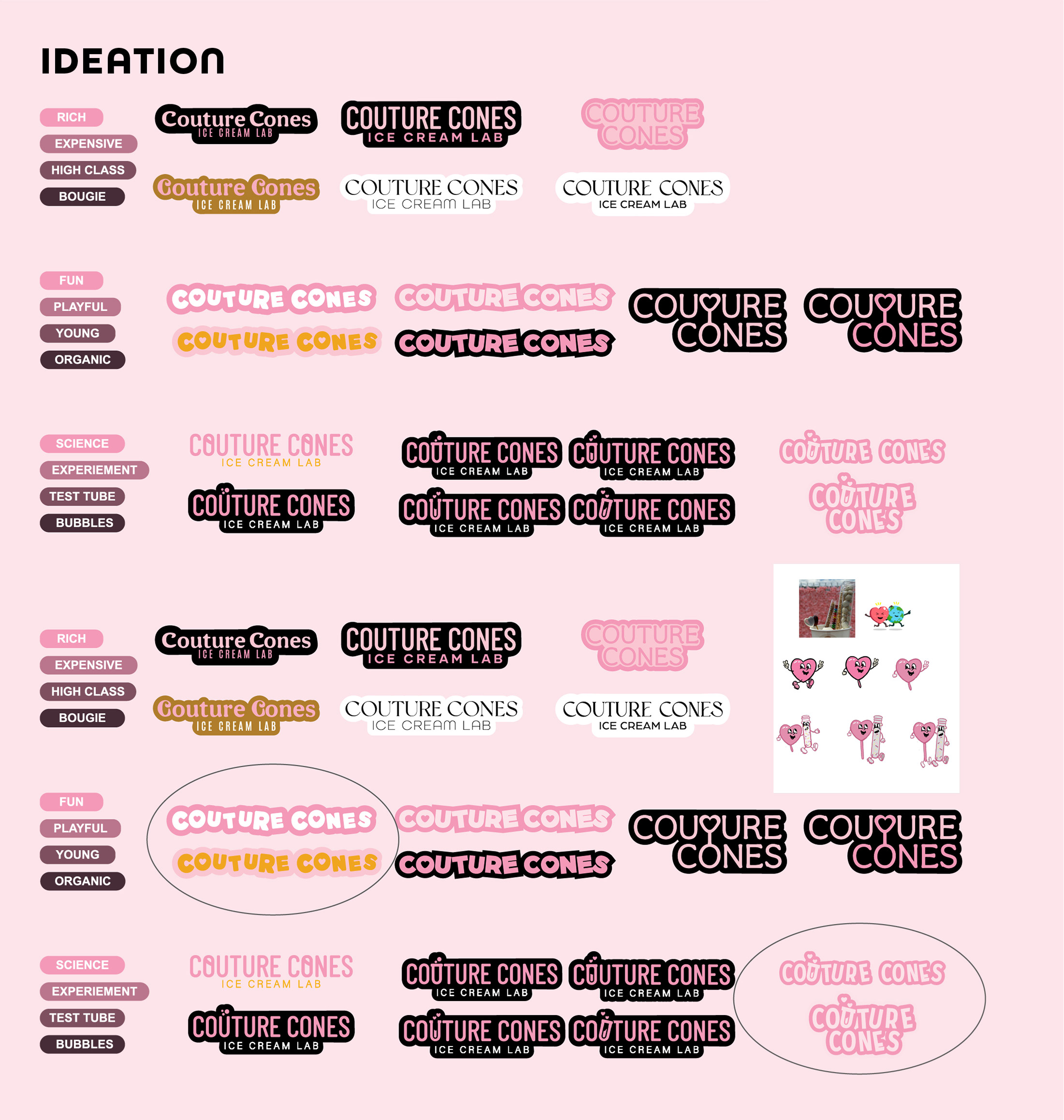 Chosen in the end was this combination mark. Featuring playful illustrated characters and a bright pink colour palette, this mark inspires to create an energetic brand that appeals to a wide range of customers while also reflecting Couture Cones’ fun and welcoming identity.