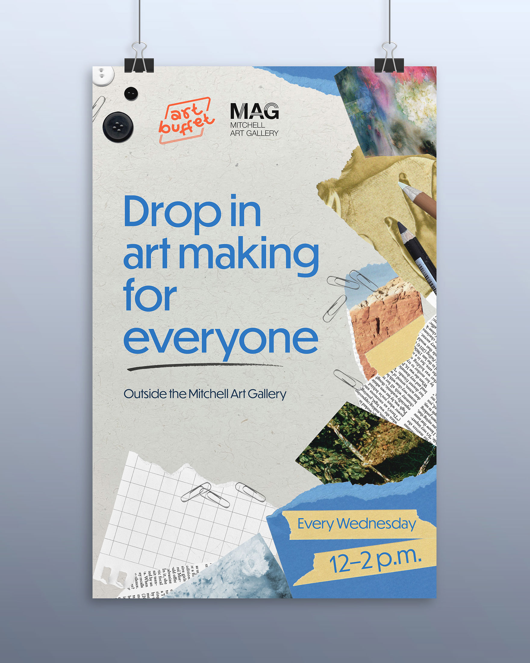 Art Buffet is a recurring event created by the John and Maggie Mitchell Art Gallery as an initiative to engage participants in free drop-in art-making. Rooted in community involvement and approachability, this branding project aims to raise awareness of the event with a welcoming, fun attitude.