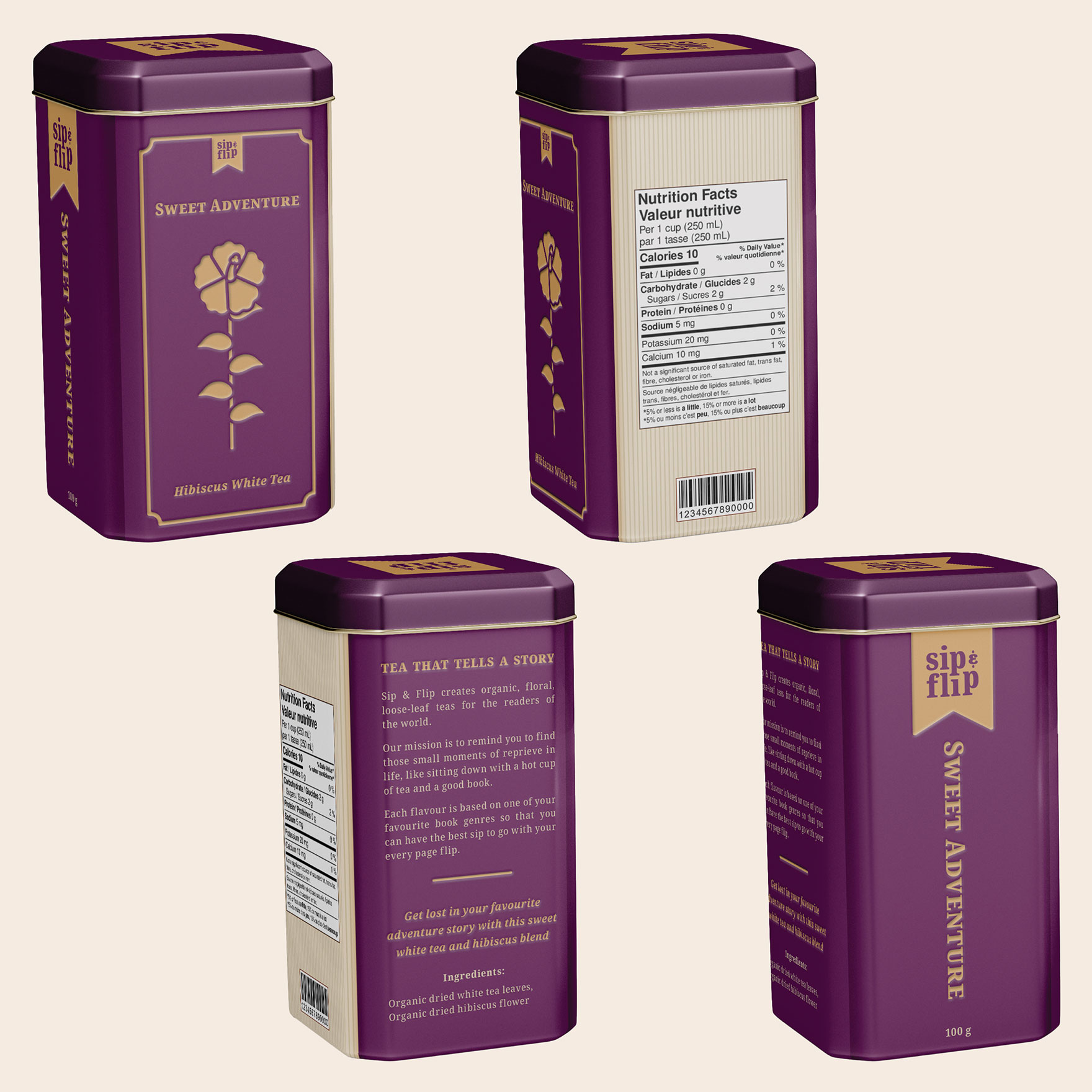 "Sip & Flip"" is a book-themed loose-leaf tea company for readers. It is part of a branded product and campaign project.